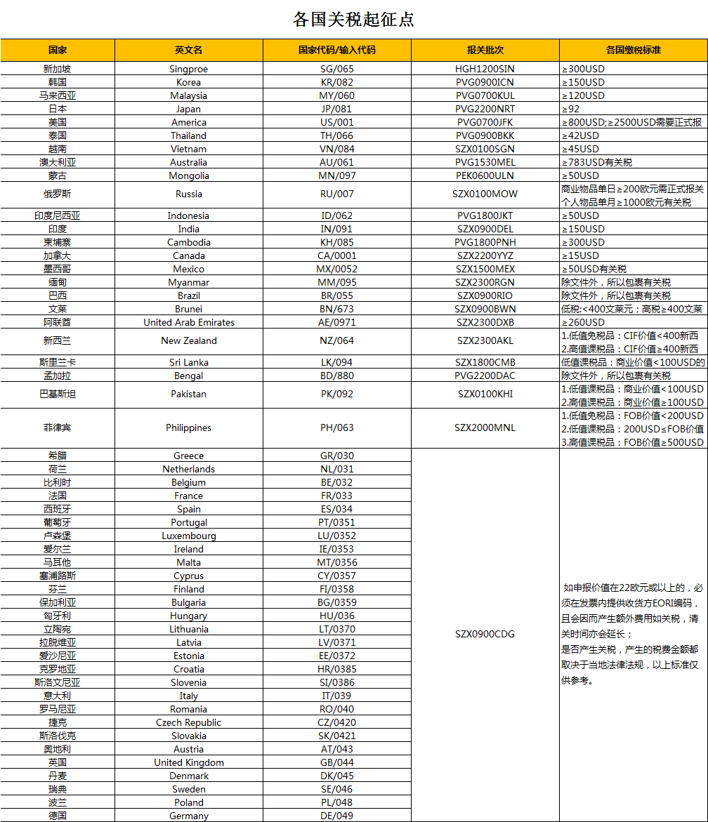 國(guó)際物流貨代:各國(guó)關(guān)稅起征點(diǎn)