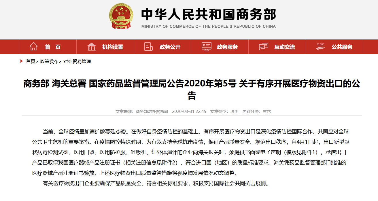 商務(wù)部、海關(guān)總署、藥監(jiān)聯(lián)合發(fā)布2020第5號(hào)公告,即日4月1日起執(zhí)行,新規(guī)對(duì)于我國(guó)出口醫(yī)療防疫物資將有新的管理標(biāo)準(zhǔn)要求。